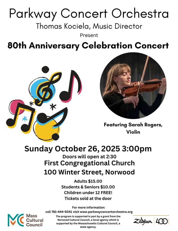 The Parkway Concert Orchestra is a community musical organization based in Norwood, Massachusetts. We provide orchestral concerts featuring a mix of classical and pops music approximately six times per year. We hope you will get to know us through this site!