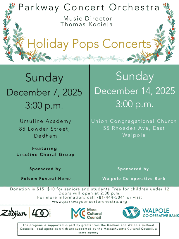 The Parkway Concert Orchestra is a community musical organization based in Norwood, Massachusetts. We provide orchestral concerts featuring a mix of classical and pops music approximately six times per year. We hope you will get to know us through this site!